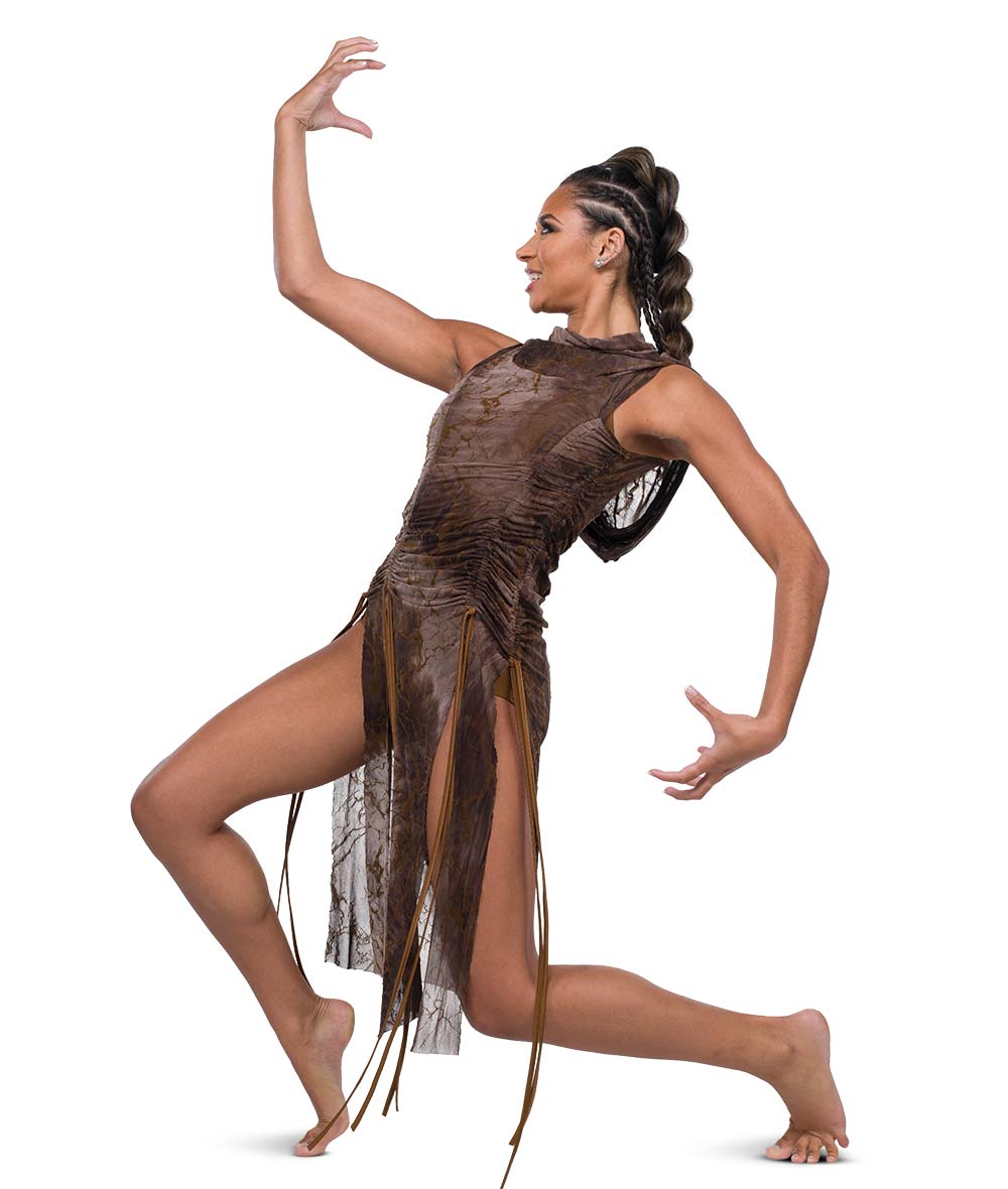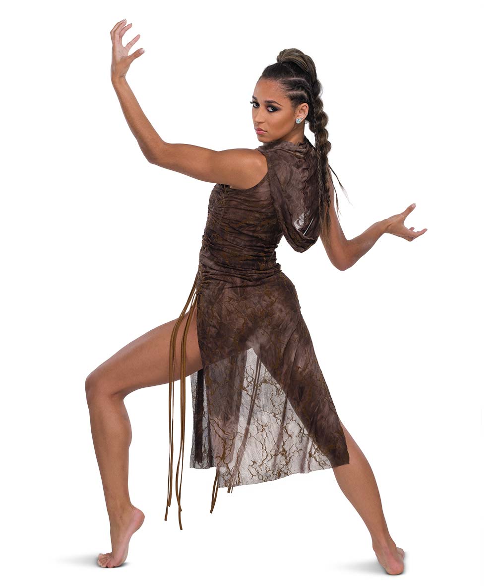 Burnout mesh hooded dress with side slits and elastic cords. Imported.